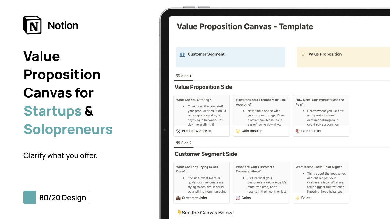 I've prepared a free Notion template for the Value Proposition Canvas, complete with a detailed step-by-step guide + example of a VPC for a fictional SaaS tool. This resource is designed to get you up and running quickly and provide you with the insights needed to craft a product that your customers will love.